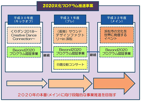 2020文化プログラム推進事業として市内文化団体事業をbeyond2020プログラム認証するとともに、平成31年度はプレイベントとなる「(仮称)サウンドデザインファクトリーin浜松」を開催し、平成32年度の本番年では浜松市の文化を世界に発信する。
