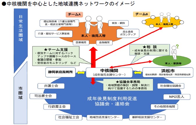 成年後見制度の利用促進の中核となるセンターを浜松市福祉交流センター内に開設し、地域の支援者等関係機関との連携により、認知症高齢者や障がい者が適切に制度を利用することができるよう支援する。