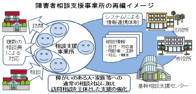 障がいのある人の自立した日常生活を支援するため、相談支援事業所を再編し、相談支援体制を強化する。
