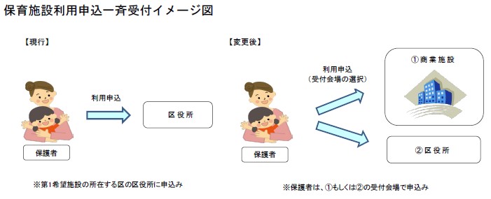 平成31年11月に実施する平成32年4月入園分の保育施設利用申込について、区役所での受付に加え、試験的に市内の商業施設で一斉受付を行う。