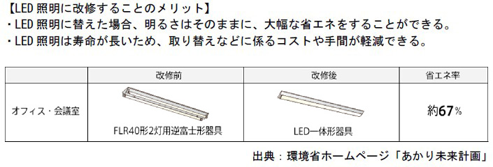省エネを推進するため、市有施設の旧型蛍光灯をLED照明に切替えることにより、温室効果ガス及び光熱費の削減を図る。
