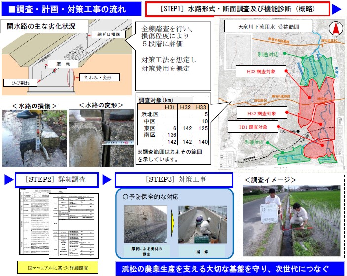 天竜川下流用水の開渠に対して全線踏査による水路形式・断面調査及び機能診断を行い、劣化状況を5段階で分類する。本事業は下図のSTEP1に該当する。
