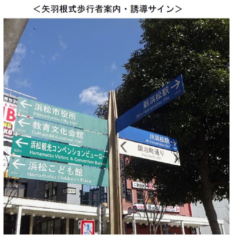中心市街地にある矢羽根式の歩行者案内・誘導サインは、老朽化して変形や変色が進んでいるものが見られる。