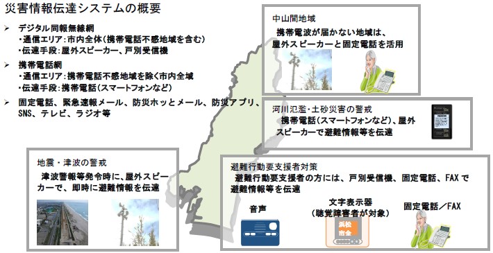 防災拠点 169本、津波避難対策として沿岸部 63本、 河川氾濫避難対策として河川沿い 25本、 土砂災害警戒区域等の山間部 211本 ※市内全域に可聴エリアを拡充 |