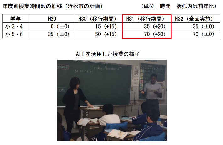 授業時間の増加に対応し、ALTによる語学指導時間を増やし、英語によるコミュニケーション能力の育成を図る。