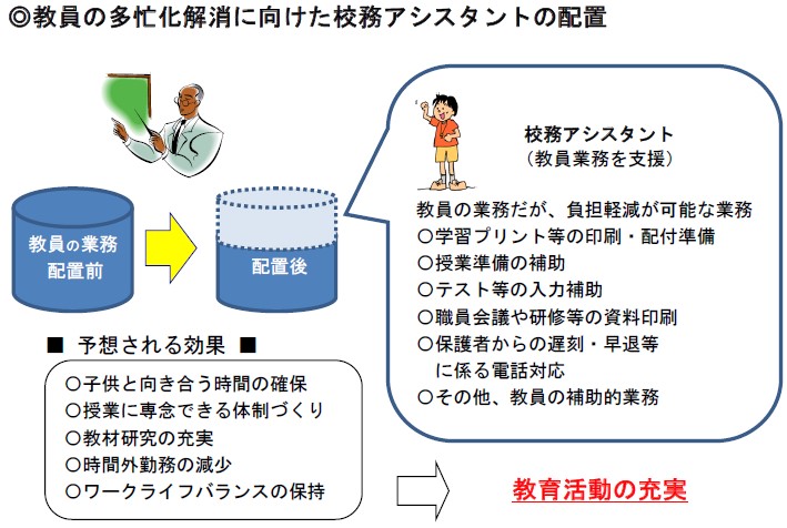 教員の多忙化解消のため、教員業務の負担軽減に効果のある校務アシスタントを市立全小中学校へ配置する。