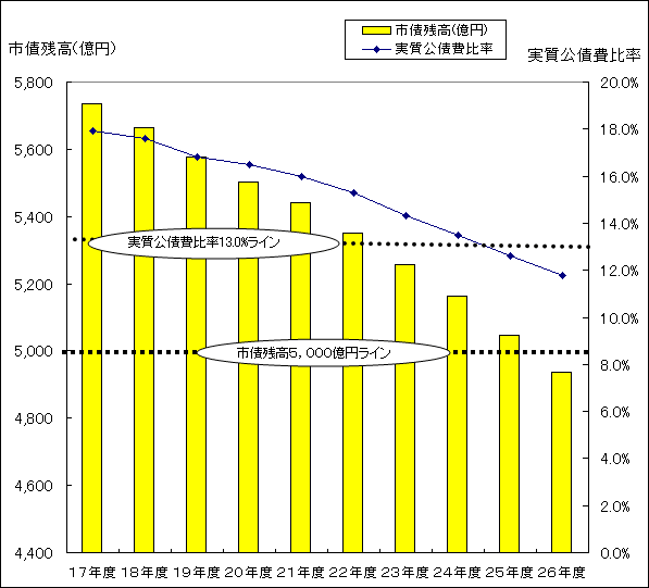 新中期財政計画では、実質公債費比率の改善目標値として22年度16.0%未満、26年度13.0%未満と設定する。