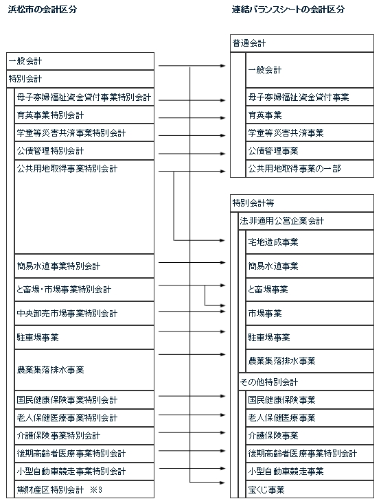 一方、連結財務書類では、浜松市を構成する一般会計、特別会計及び地方公共団体ほか、連携協力して行政サービスを実施している浜名湖競艇企業団のような一部事務組合・広域連合※1や土地開発公社や文化振興財団のような外郭団体※2を含め、1つの行政サービス実施主体とみなしている。